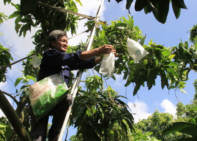 Kỹ thuật bao xoài rất đơn giản và nhanh chóng, tiết kiệm thời gian và công sức. Người trồng vườn chỉ cần vành miệng túi ra bao những quả xoài bên dưới thấp lại, sau đó rút dây lại chốt bằng miếng cao su gắn sẵn trên miệng túi là xong.